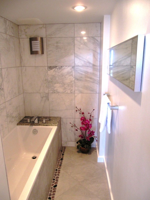 On one side of the vanity is the bathing area. The elongated tub by Phillipe Stark for Duravit keeps the space open. The spa theme is continued with classic grey and white marble tile on the walls and suede like porcelain floor tile from Sunset Tile.
