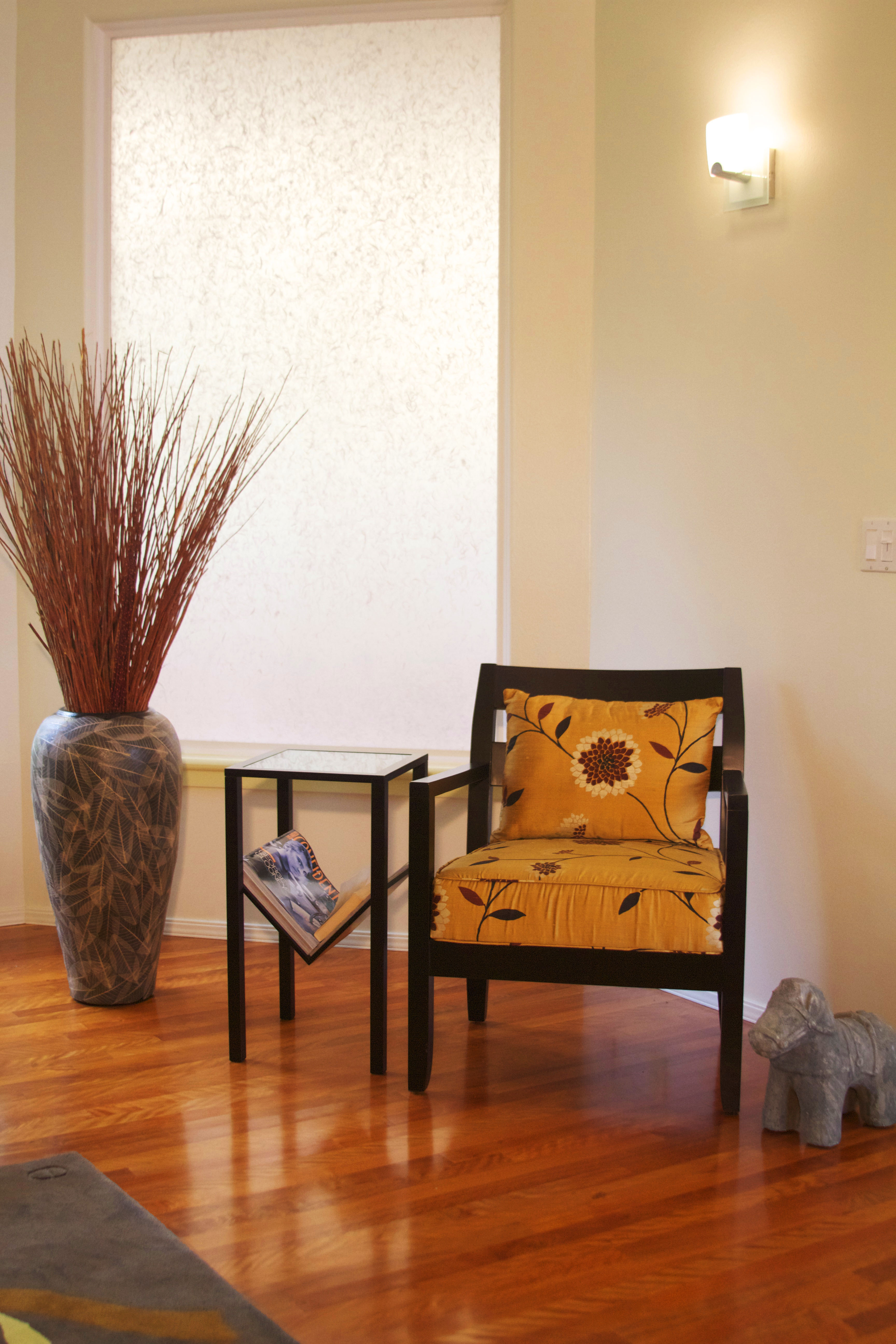 Private space in Living Room the chair from Crate & Barrel, custom silk fabric by S. Harris and the magazine table by Porada Italy.