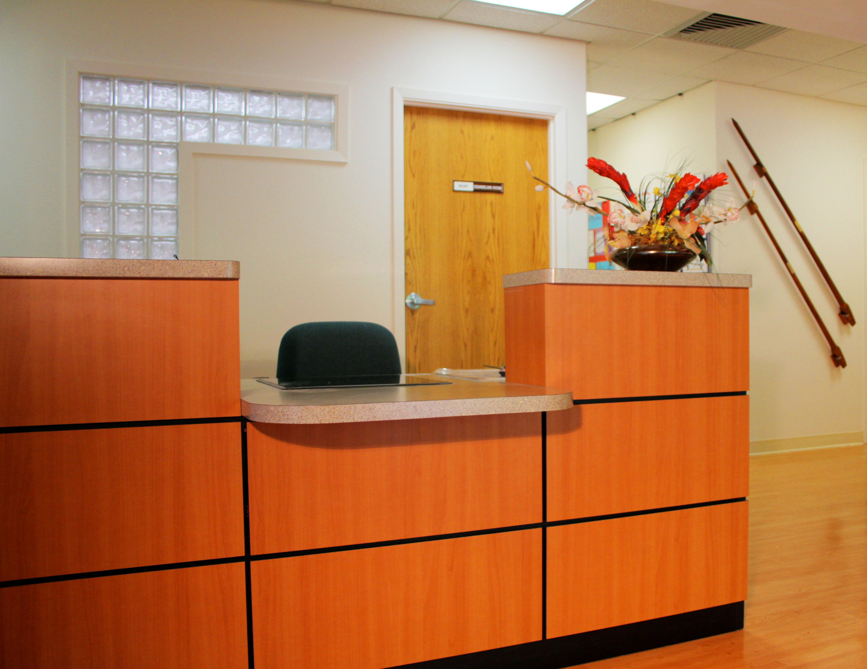 Lobby reception desk. Desk is custom designed in maple with black recessed reveals.