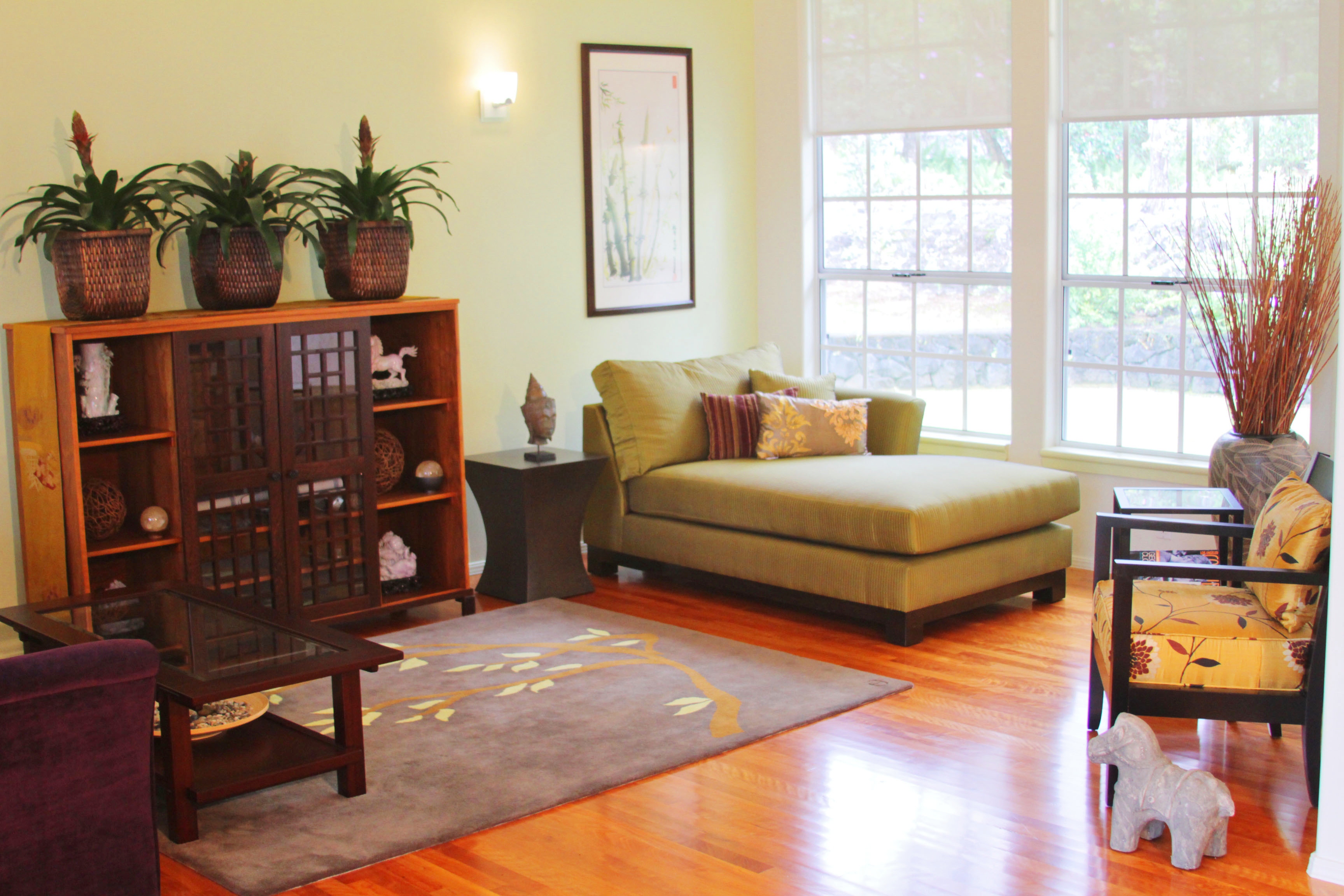 The living room becomes a space where East meets West. The wall unit is a custom designed piece by Adrienne Oliver.