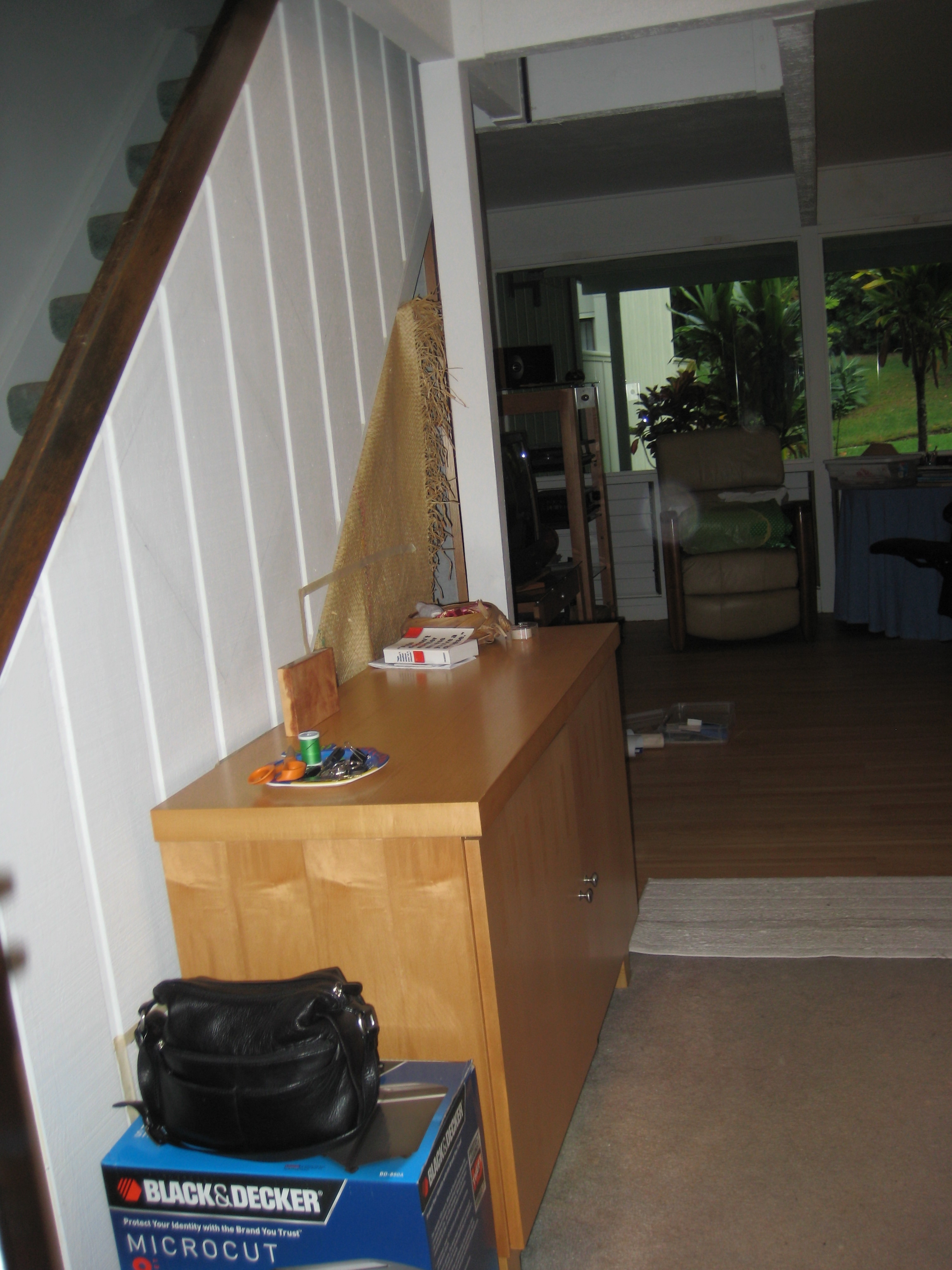 BEFORE PHOTO: The entry foyer to the townhouse was dark and the enclosed carpet stairway had a very dated look.