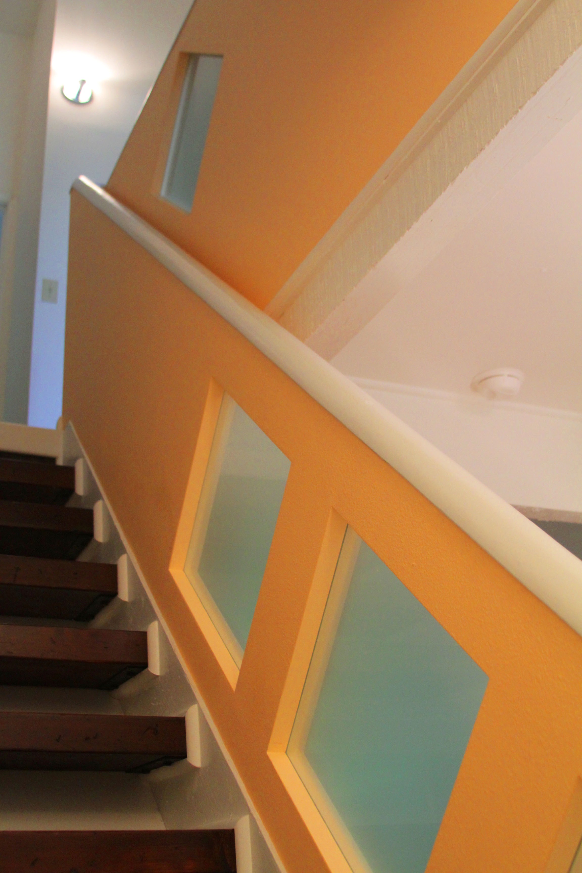 This townhouse remodel included redesigning the entry foyer, the stairway, powder room and guest bath. The total project budget was fifty thousand dollars. The stair railing was redesigned with inset etched glass squares and an industrial look was given to to the stairs by exposing the wood.