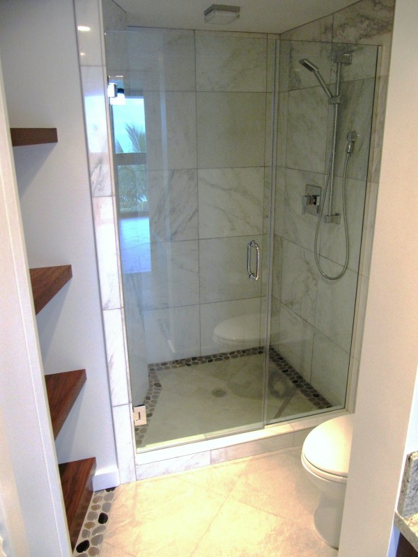Custom shower with seamless glass enclosure keeps the space open.