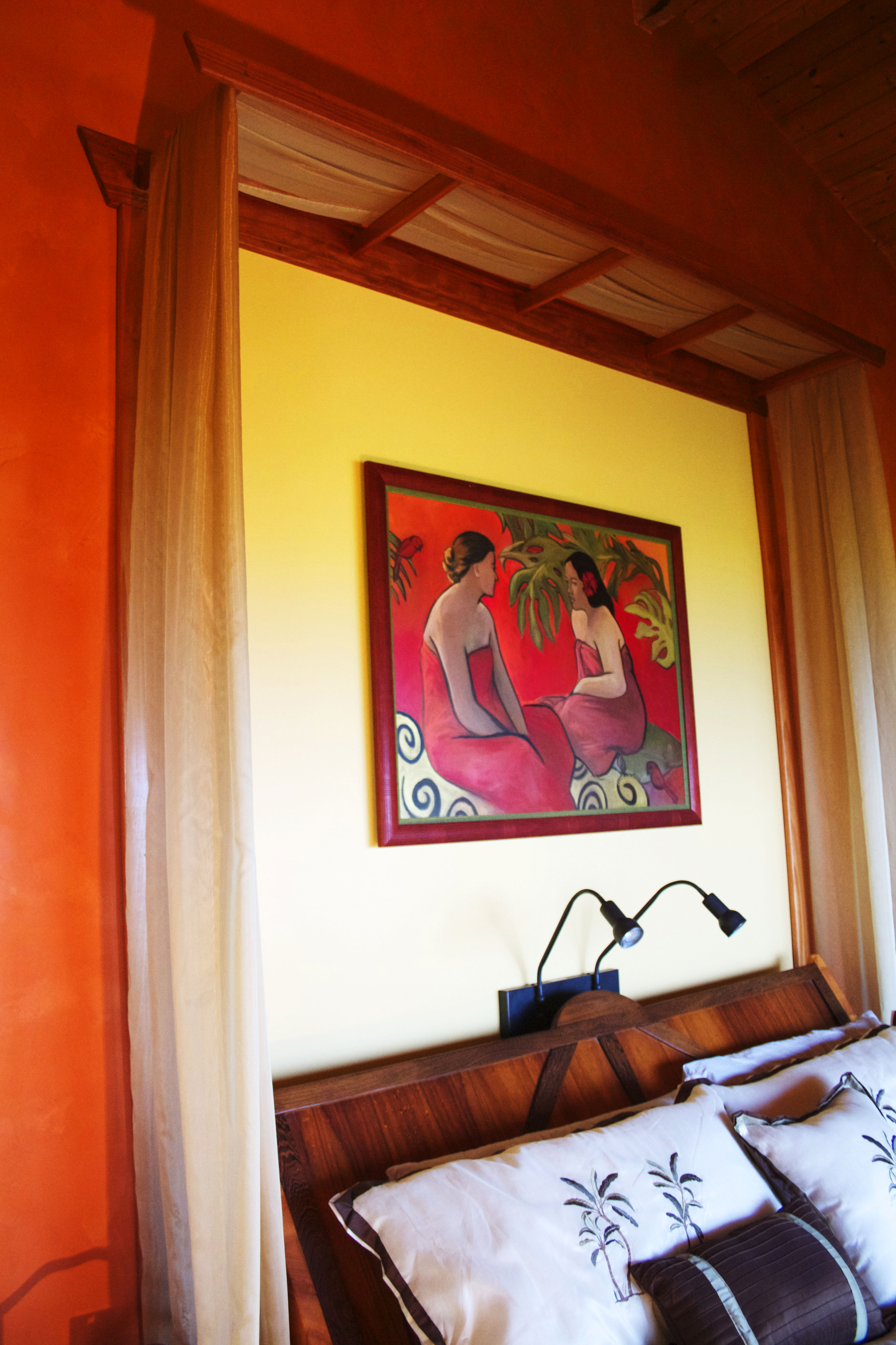 The focus of the art is further created by the soft drape of fabric at the head of the bed and the rich orange tones of the wall.